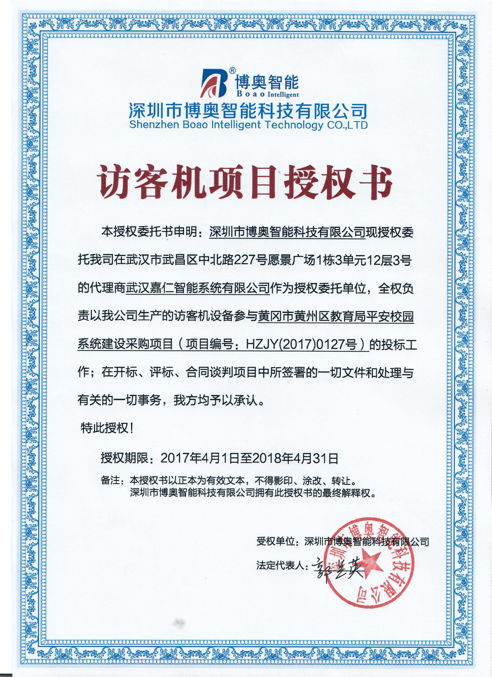 現(xiàn)授權我公司訪客機武漢代理商武漢嘉仁智能系統(tǒng)有限公司參與黃岡市黃州區(qū)教育局平安校園系統(tǒng)建設采購項目中的訪客登記管理系統(tǒng)投標工作,訪客登記管理系統(tǒng)包含訪客機設備和訪客登記管理軟件。