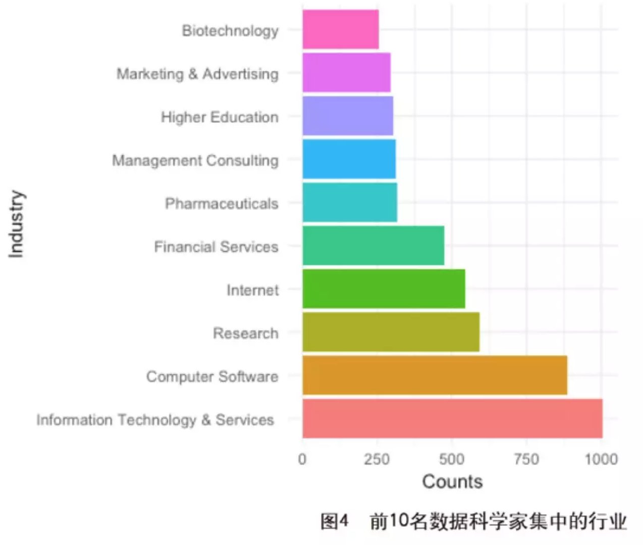 數(shù)據(jù)科學家所處的行業(yè)也集中在科技或者研究性組織,圖4是排名前10的行業(yè)。
