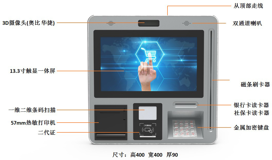 壁掛式社保一體機(jī)是博奧智能專為社保局、醫(yī)院、藥店等場(chǎng)所設(shè)計(jì)加工的一款集成多功能終端,采用安安卓系統(tǒng);本產(chǎn)品集成13.3寸觸顯一體屏、3D攝像頭(支持奧比、華捷)、熱敏打印機(jī)、身份證閱讀器、社保卡銀行卡讀卡器、磁條刷卡器、一維二維碼掃描、密碼銀行等模組,主要用來(lái)實(shí)現(xiàn)社保查詢、醫(yī)療繳費(fèi)、購(gòu)買藥品等。
