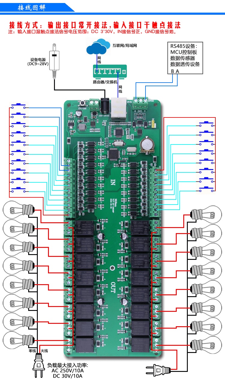 ??? 設(shè)備采用工業(yè)級設(shè)計方案,搭載32 ARM 處理器和10/100M 以太網(wǎng)網(wǎng)絡(luò)方案,具有速度快,運算能力強,穩(wěn)定性高,抗干擾能力強等特點,滿足工業(yè)環(huán)境使用要求。設(shè)備有16 路繼電器輸出、18 路開關(guān)量隔離輸入和1 RS485 接口,繼電器支持實時控制、延時控制、輸入輸出聯(lián)動控制、一鍵全開全關(guān)控制、日循環(huán)定時控制和自定義日期控制等多種控制方式,開關(guān)量輸入狀態(tài)支持被動上傳、定時上傳和觸發(fā)上傳,RS485 接口支持用于控制設(shè)備或傳輸數(shù)據(jù),以滿足更多不同的場合使用,滿足更多用戶的使用需求。