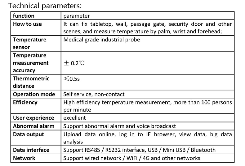 Due to the new crown epidemic situation, public equipment should avoid contact cross infection as much as possible; this product uses non-contact medical grade special probes and precise laser ranging; unique dual sensors, advanced intelligent temperature measurement algorithm combining distance data, to achieve accurate palm temperature detection; efficient and fast temperature measurement;