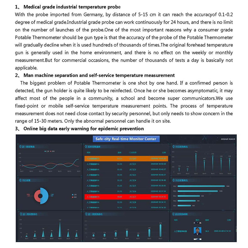 The biggest problem of Potable Thermometer is one shot by one hand. If a confirmed person is detected, the gun holder is quite likely to be reinfected. Once he or she becomes asymptomatic, it may affect most of the people in a community, a school and become super communicators.We use fixed-point or mobile self-service temperature measurement points. The process of temperature measurement does not need close contact by security personnel, but only needs to show concern in the range of 15-30 meters. Only the abnormal personnel can handle it on site.