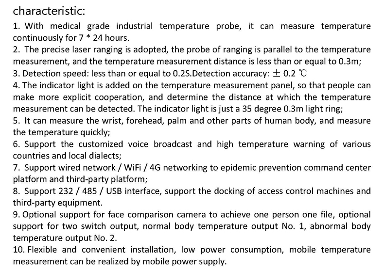 Through the 7-inch visual terminal, built-in Android system, display the measured temperature value and voice broadcast. When the test temperature reaches or exceeds "37.30", it will display the temperature abnormality and send out the alarm sound;