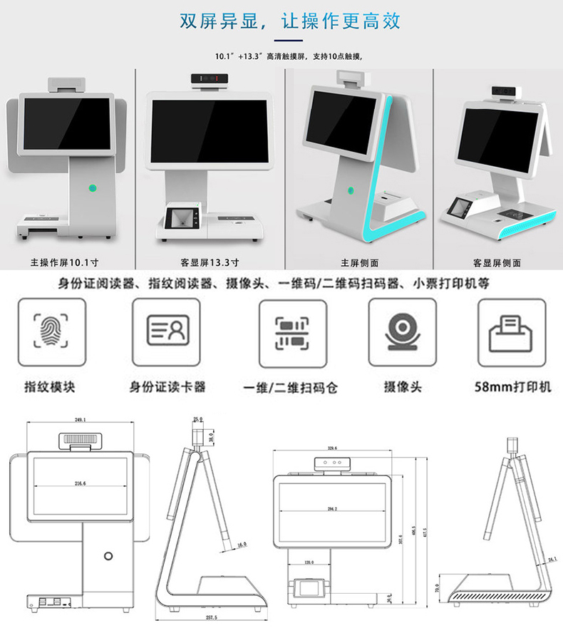 功能配置:主屏10.1寸 副屏13.3寸 身份證閱讀器 IC卡讀寫器 58mm熱敏打印機(jī) 條碼掃描儀 指紋(選配)