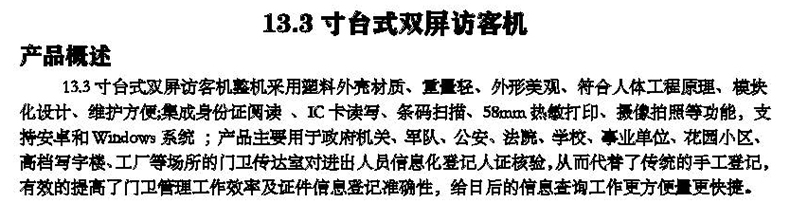 13.3寸臺式雙屏訪客機(jī)整機(jī)采用塑料外殼材質(zhì)、重量輕、外形美觀、符合人體工程原理、模塊化設(shè)計、維護(hù)方便;集成身份證閱讀 、IC卡讀寫、條碼掃描、58mm熱敏打印、攝像拍照等功能,支持安卓和Windows系統(tǒng) ;產(chǎn)品主要用于政府機(jī)關(guān)、軍隊、公安、法院、學(xué)校、事業(yè)單位、花園小區(qū)、高檔寫字樓、工廠等場所的門衛(wèi)傳達(dá)室對進(jìn)出人員信息化登記人證核驗,從而代替了傳統(tǒng)的手工登記,有效的提高了門衛(wèi)管理工作效率及證件信息登記準(zhǔn)確性,給日后的信息查詢工作更方便量更快捷。
