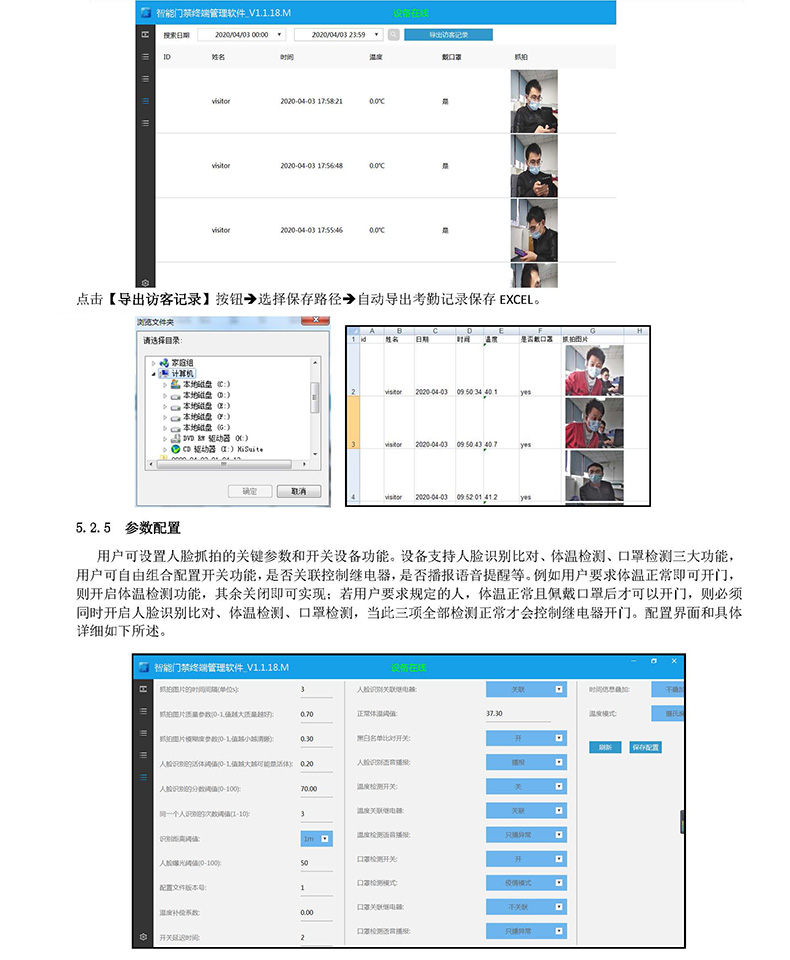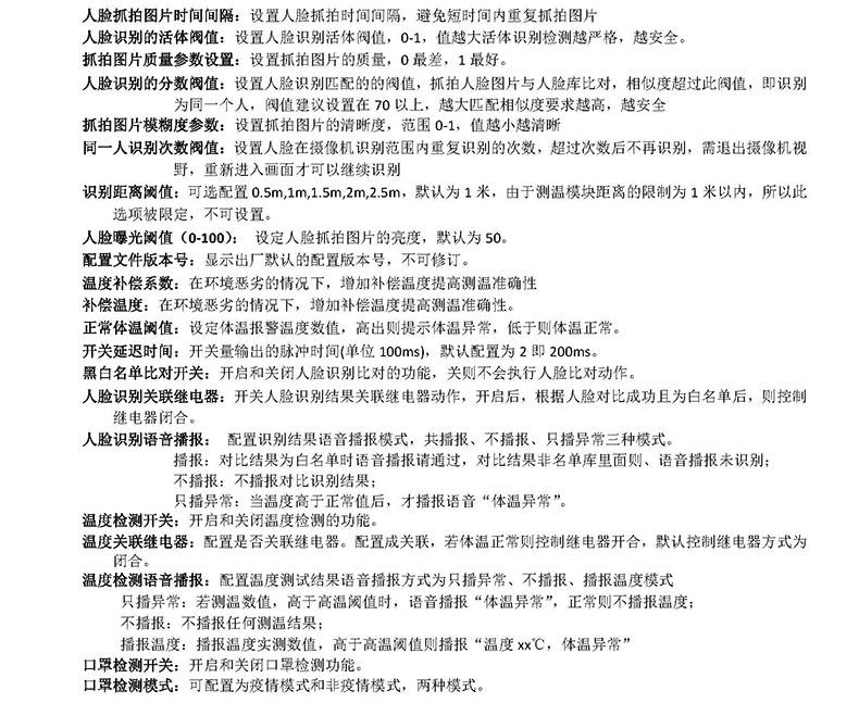 ???用戶可設(shè)置人臉抓拍的關(guān)鍵參數(shù)和開關(guān)設(shè)備功能。設(shè)備支持人臉識別比對、體溫檢測、口罩檢測三大功能,用戶可自由組合配置開關(guān)功能,是否關(guān)聯(lián)控制繼電器,是否播報語音提醒等。例如用戶要求體溫正常即可開門,則開啟體溫檢測功能,其余關(guān)閉即可實現(xiàn);若用戶要求規(guī)定的人,體溫正常且佩戴口罩后才可以開門,則必須同時開啟人臉識別比對、體溫檢測、口罩檢測,當(dāng)此三項全部檢測正常才會控制繼電器開門。配置界面和具體詳細(xì)如下所述。