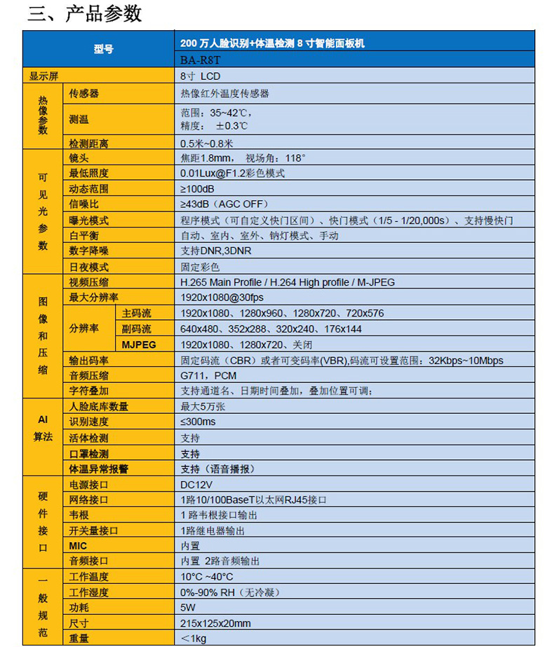 200萬像素測溫人臉識別智能面板機系列產(chǎn)品,采用LCD顯示屏幕,內(nèi)嵌深度學(xué)習(xí)人臉識別算法,集成高精度熱成像測溫芯片,ISP圖像處理等技術(shù)于一體的AI智能門禁產(chǎn)品。該產(chǎn)品具備人臉檢測、口罩檢測、人臉識別比對、體溫檢測、活體判斷等強大功能。可精確捕獲通過攝像機視野的人員信息(諸如面部信息、身份信息、是否戴口罩等信息)、以及體表溫度??捎行椭脩艄芾沓鋈肴藛T權(quán)限以及監(jiān)測器體溫狀態(tài),有助于防范疫情。用戶可通過加載人臉庫到設(shè)備,脫機管理出入權(quán)限。也可搭配考勤軟件,實現(xiàn)員工考勤管理??蓮V泛應(yīng)用于小區(qū)門禁、道閘通道、寫字樓等場景!