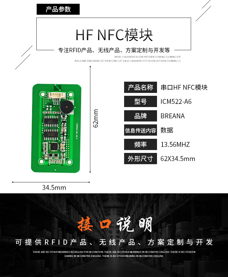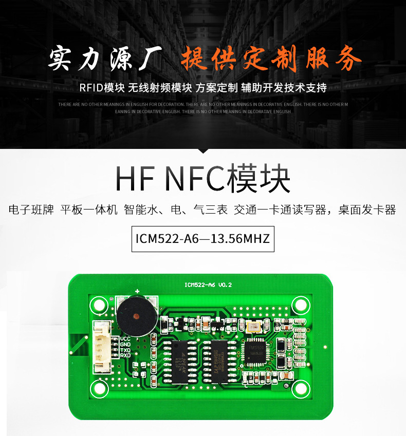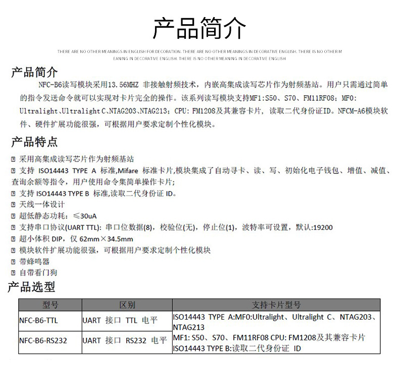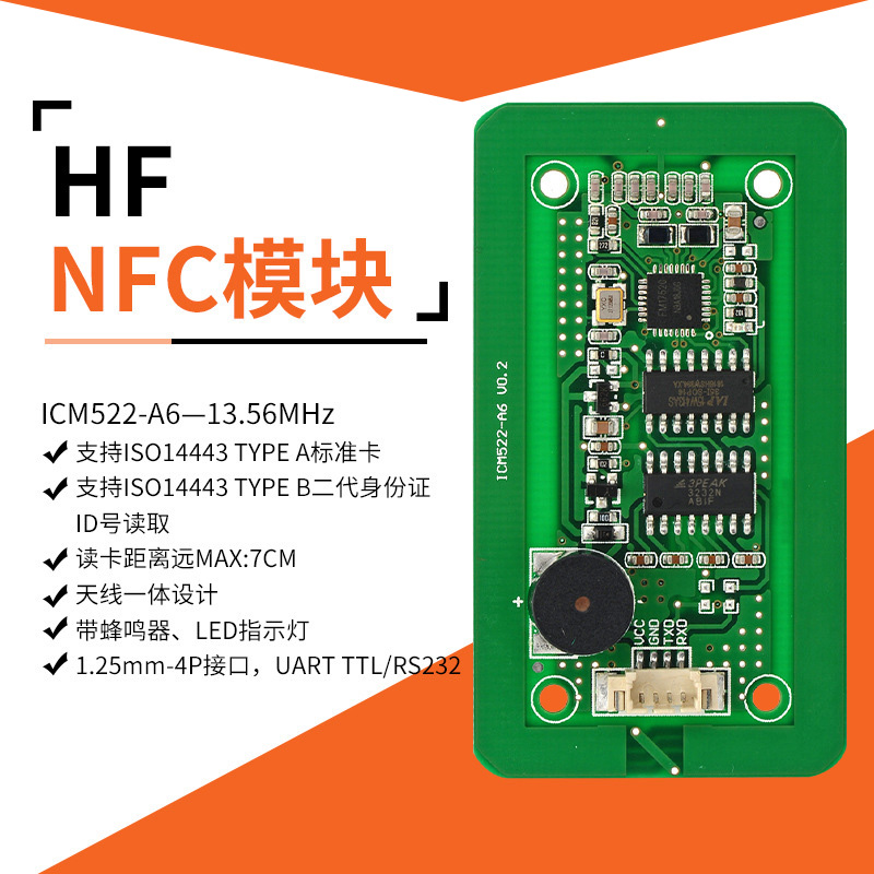 NFC-B6讀寫(xiě)模塊采用13.56MHZ 非接觸射頻技術(shù),內(nèi)嵌高集成讀寫(xiě)芯片作為射頻基站。用戶只需通過(guò)簡(jiǎn)單的指令發(fā)送命令就可以實(shí)現(xiàn)對(duì)卡片完全的操作。該系列讀寫(xiě)模塊支持MF1:S50、S70、FM11RF08;MF0: Ultralight、Ultralight C、NTAG203、NTAG213;CPU: FM1208及其兼容卡片, 讀取二代身份證ID。NFCM-A6模塊軟件、硬件擴(kuò)展功能很強(qiáng),可根據(jù)用戶要求定制個(gè)性化模塊。