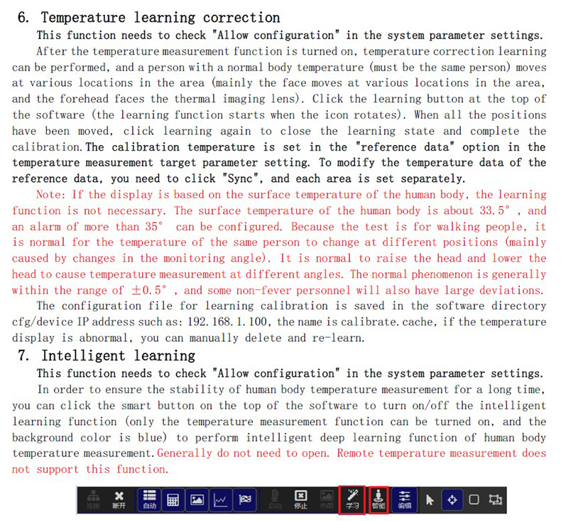 為了保證長時間人體測溫的穩(wěn)定性,可以點擊軟件上方智能按鈕開啟/關閉智能學習功能(只有啟動測溫功能才能開啟,底色為藍色為開啟),進行人體測溫智能深度學習功能。一般不需要開啟。遠端測溫不支持此功能。