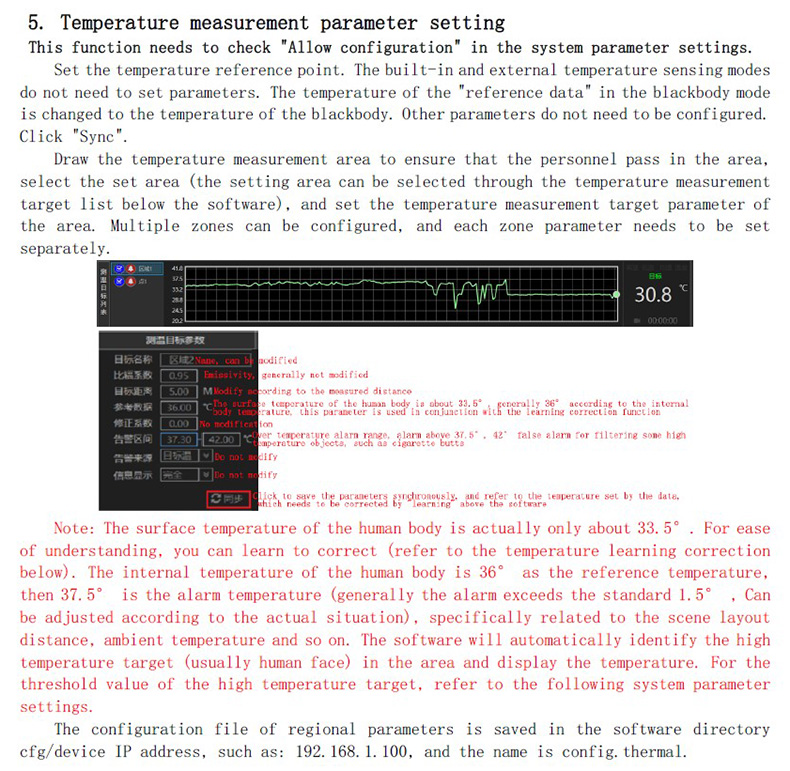 注:人體表面溫度實際只有33.5°左右,為了便于理解,可以通過學習校正(參考下面溫度學習校正)人體體內溫度36°為基準溫,那么按37.5°為報警溫度(一般按超過標準1.5°報警,可根據(jù)實際情況調整),具體和場景布置距離,環(huán)境溫度等有關。軟件會自動標識區(qū)域內的高溫目標(一般是人臉)并顯示溫度,抓取高溫目標的門限值參考下面系統(tǒng)參數(shù)設置。