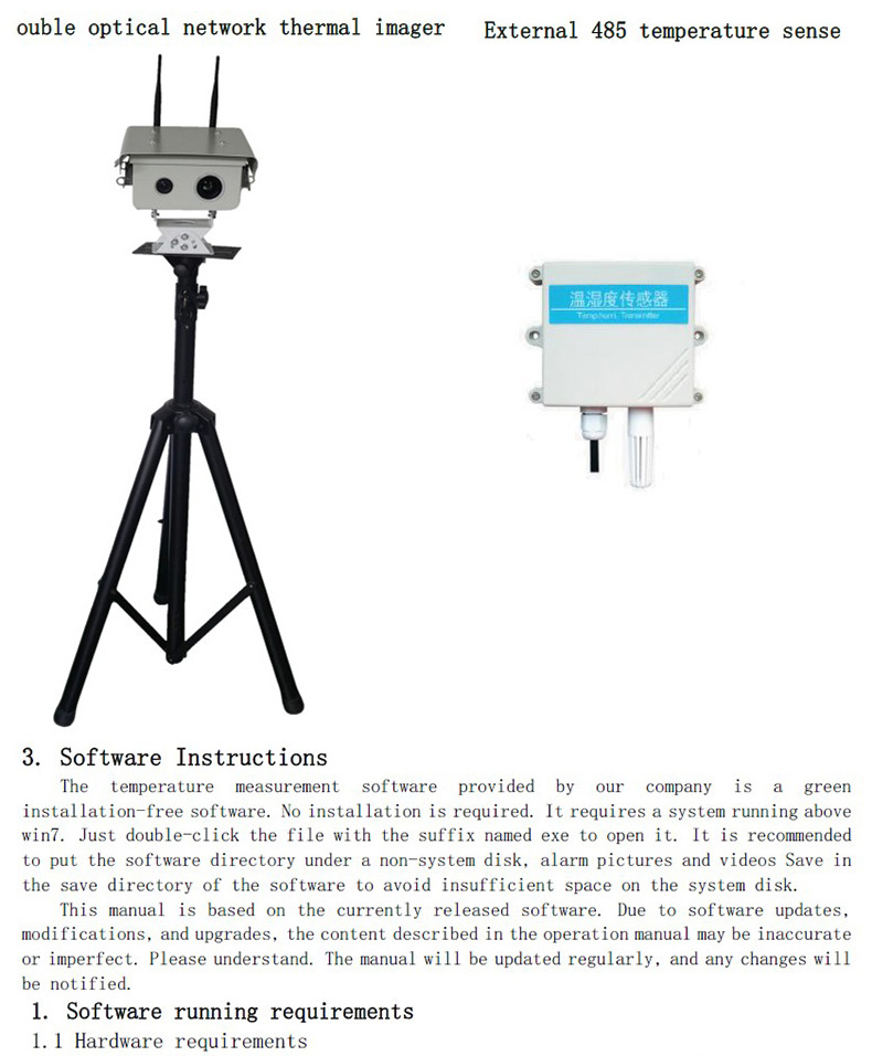 選擇一個室內壞境,通過三腳架或支架固定安裝熱像儀,如果使用外置485溫感(溫感485接口和熱像的485接口連接,供電也可以和熱像共用一個電源),場地有條件情況下,把外置485溫感安裝在熱像畫面的左上方或右上方。有些場地沒有條件,可以把外置溫感放置在三角架下。如果外置溫感安裝在畫面中(等同于黑體的作用),環(huán)境溫度的變化對測溫精度度影響很小,設備會自動校正,如果安裝在別處,畫面中背景環(huán)境溫度變化的話,會影響測溫精度,如果測溫精度下降,可手動重新校正溫度。如果使用黑體,把黑體放置在監(jiān)控畫面中,一般選左右上方。