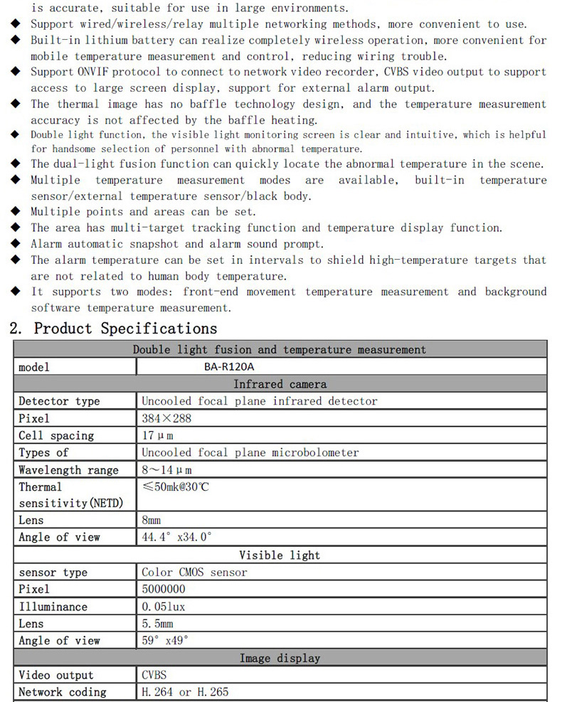 無線雙光融合人體高精度測溫儀,具有雙光融合功能,可快速準確地分辨溫度異常人員,可輸出無線/有線網(wǎng)絡信號,配合后臺PC測溫軟件,可實現(xiàn)非接觸快速大流量人體溫度異常篩選功能,采用最新智能測溫模型,無擋片成像方式,可以連續(xù)不間斷對目標人群進行溫度檢測,測溫精度可達±0.3°(配置黑體可達±0.1°-0.3°)。