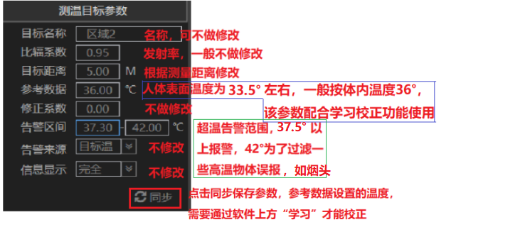 開啟測溫功能后,才能進行溫度校正學習,讓一個正常體溫的人(必須是同一個人)在區(qū)域各個位置移動(主要是人臉在區(qū)域各個位置移動,額頭對著熱像鏡頭),移動前點擊軟件上方學習按鈕(圖標轉動的時候表示學習功能啟動),當移動完成所有位置時,再次點擊學習關閉學習狀態(tài),完成校正。校正溫度設置在測溫目標參數(shù)設置里的“參考數(shù)據(jù)"選項配置,修改好參考數(shù)據(jù)的溫度數(shù)據(jù),需要點擊“同步”,每個區(qū)域單獨設置。