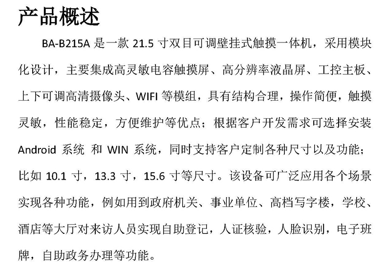 BA-B215A是一款21.5寸雙目可調(diào)壁掛式觸摸一體機,采用模塊化設(shè)計,主要集成高靈敏電容觸摸屏、高分辨率液晶屏、工控主板、上下可調(diào)高清攝像頭、WIFI等模組,具有結(jié)構(gòu)合理,操作簡便,觸摸靈敏,性能穩(wěn)定,方便維護等優(yōu)點;根據(jù)客戶開發(fā)需求可選擇安裝Android系統(tǒng) 和WIN系統(tǒng),同時支持客戶定制各種尺寸以及功能;比如10.1寸,13.3寸,15.6寸等尺寸。該設(shè)備可廣泛應用各個場景實現(xiàn)各種功能,例如用到政府機關(guān)、事業(yè)單位、高檔寫字樓,學校、酒店等大廳對來訪人員實現(xiàn)自助登記,人證核驗,人臉識別,電子班牌,自助政務辦理等功能。