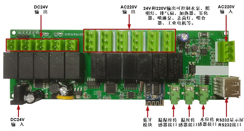 可控制水泵、照明燈、排氣扇、加熱器、霧化器、噴淋泵、殺菌燈、喂食器、馬達、工業(yè)設(shè)備等。