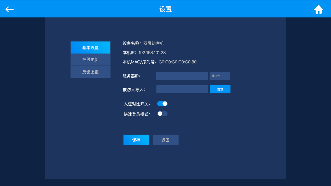 單屏智能訪客機(jī)系列產(chǎn)品,搭配13.3寸雙面LCD顯示屏幕(可選10.1寸),內(nèi)嵌深度學(xué)習(xí)人臉識別算法。內(nèi)嵌身份證解密模塊和指紋模塊。該產(chǎn)品具備人臉檢測、人證比對、活體判斷等強(qiáng)大功能??捎行椭脩艄芾碓L客出入人員權(quán)限,有助于防范疫情。所有數(shù)據(jù)既可脫機(jī)管理,也可以連上云平臺。也可搭配人臉面板機(jī)聯(lián)動,實(shí)現(xiàn)訪客出入無紙化??蓮V泛應(yīng)用于小區(qū)門口、學(xué)校出入口、酒店入住,以及寫字樓等場景!