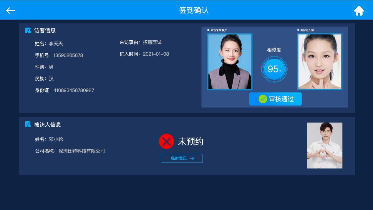 在首頁界面,來訪者可直接刷身份證進(jìn)行簽到確認(rèn),身份證識別成功后,會自動跳轉(zhuǎn)至人證比對界面。比對成功后會直接提示是否簽到成功。