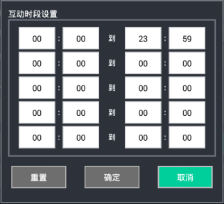互動時段設(shè)置界面如下圖所示,最多可設(shè)置五個終端機(jī)的互動時段,00:00~00:00表示空配置項(xiàng),00:00~23:59表示全天均可互動。終端機(jī)只有在配置的互動時段內(nèi)才可以通過交互觸發(fā)互動節(jié)目的播放。