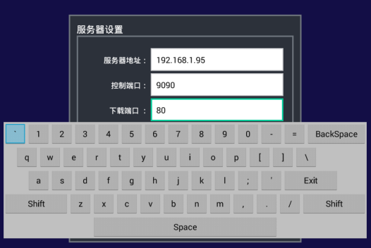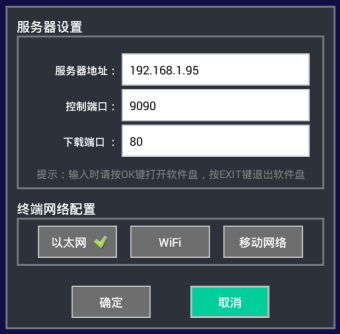 終端服務(wù)器設(shè)置中的服務(wù)器地址為終端需要連接到信息發(fā)布服務(wù)器電腦的IP地址(注:需要填寫電腦實(shí)際IP地址,請不要填127.0.0.1的地址)或者域名(域名前請不要添加http://前綴);控制端口為終端實(shí)時在線控制服務(wù)端口號如9090;下載端口為內(nèi)容下載服務(wù)器端口號如80??刂贫丝诤拖螺d端口實(shí)際上是服務(wù)器端的配置參數(shù),終端需要連接到服務(wù)器就必須和服務(wù)器的設(shè)置端口完全一致。