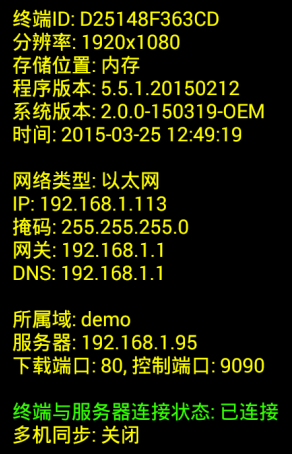 BA-iDS6終端軟件內(nèi)置安裝在安卓主板上,主板開機(jī)后自動運(yùn)行終端程序進(jìn)入播放狀態(tài)。按遙控器的INFO鍵,或快速點(diǎn)擊屏幕任意一個角落四次,可呼出如下圖所示的終端運(yùn)行狀態(tài)信息,包括終端ID、分辨率、節(jié)目存儲位置、播放程序版本、安卓系統(tǒng)版本、機(jī)器時間、網(wǎng)絡(luò)參數(shù)、服務(wù)器參數(shù)、終端到服務(wù)器的連接狀態(tài)、多級同步開關(guān)等信息。