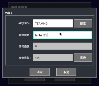 WiFi配置如下面圖片所示,可通過WiFi配置界面的搜索按鈕打開手動搜索界面,通過刷新按鈕更新無線AP列表,并在搜索結(jié)果列表中選擇合適的AP名稱(AP名稱也可以自行手動直接輸入),同時輸入相應(yīng)的網(wǎng)絡(luò)密鑰即可完成WiFi的設(shè)置。如果某些AP不支持DHCP動態(tài)分配IP地址或者網(wǎng)絡(luò)環(huán)境不允許使用動態(tài)IP地址,則可通過高級按鈕進(jìn)入手動設(shè)置IP地址界面(設(shè)置界面完全類似以太網(wǎng)的手動設(shè)置IP地址界面)。