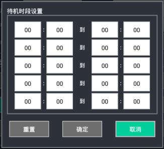 待機(jī)時段設(shè)置界面如下圖所示,最多可設(shè)置五個終端機(jī)的待機(jī)時段,00:00~00:00表示空配置項(xiàng)。終端機(jī)一旦進(jìn)入待機(jī)時段時間點(diǎn)則停止播放且輸出黑屏。
