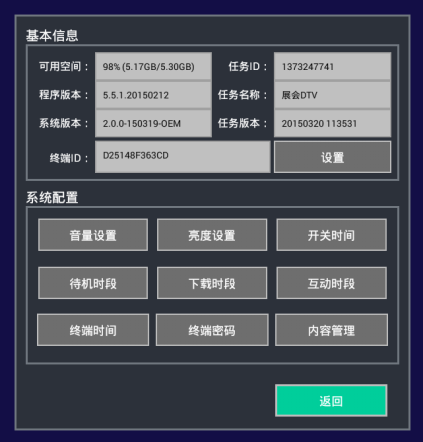 終端系統(tǒng)配置功能中包括音量設(shè)置、亮度設(shè)置、開關(guān)時間、待機(jī)時段、下載時段、互動時段、終端時間、終端密碼、內(nèi)容管理等。