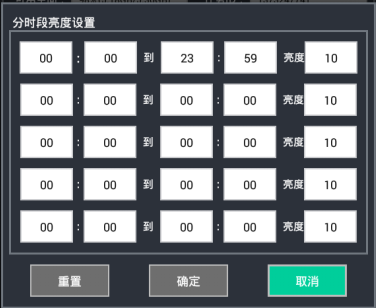 亮度設(shè)置界面如下圖所示,最多可指定5個不同時段的亮度,默認(rèn)情況下全天不分時段則只需要指定第一段00:00~23:59的亮度值。亮度值通常是0最暗、10最亮,但是有些LED屏的背光電路亮暗邏輯是反的。