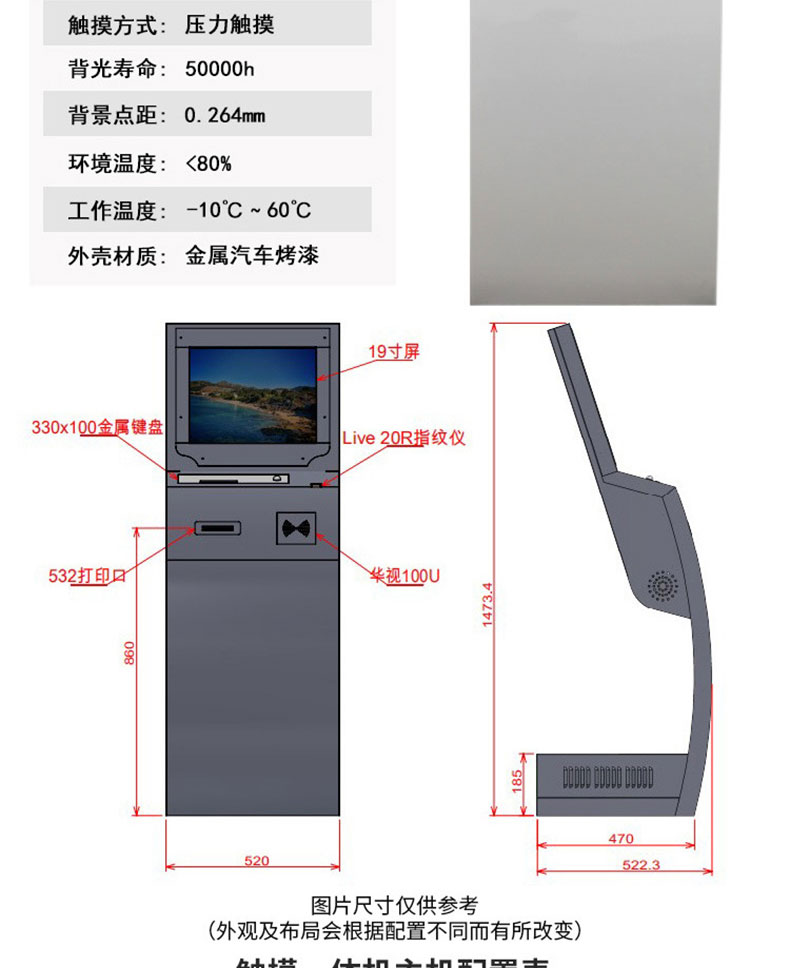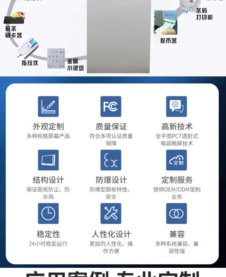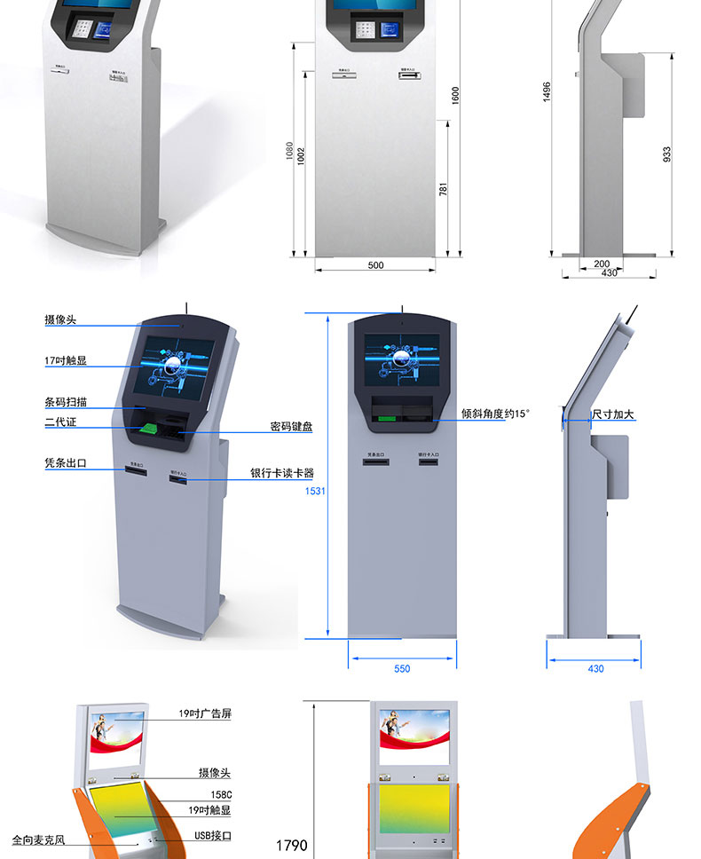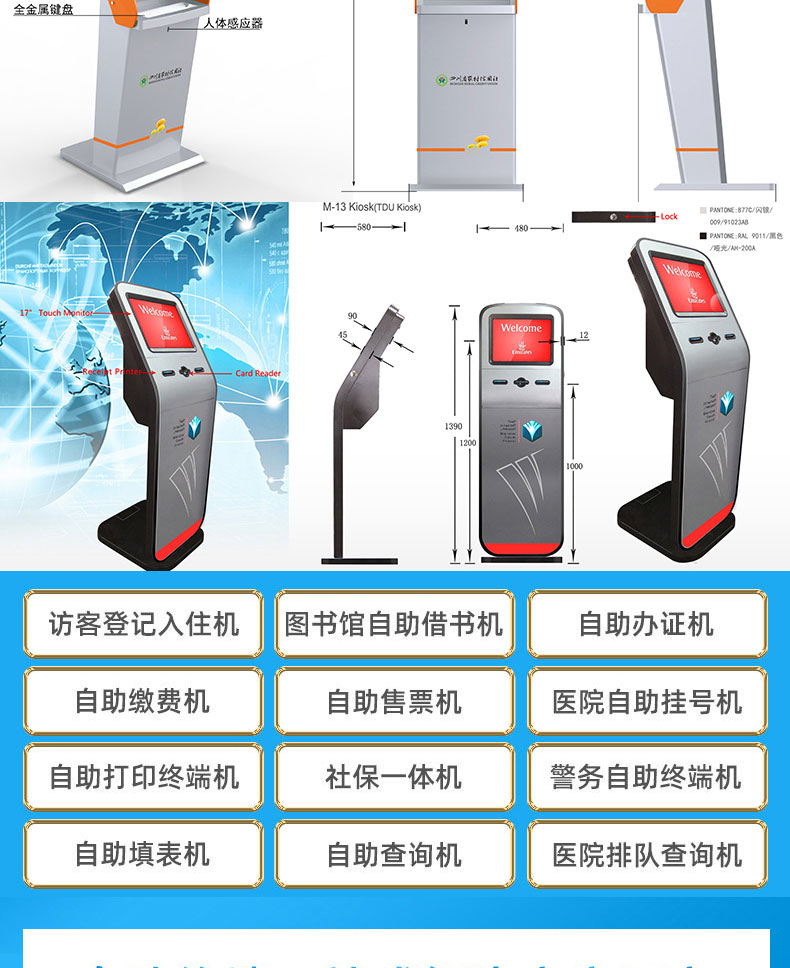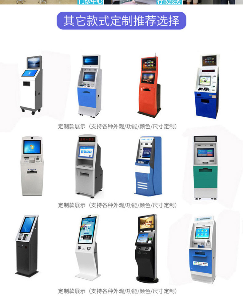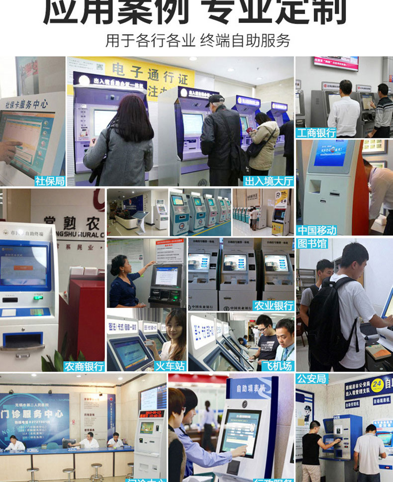 自助終端機定制:定制各種場景各種款式非標終端機;例如訪客機、景區(qū)自助取票機、醫(yī)院繳費查詢機、醫(yī)院自助取單機、社保查詢機、室內(nèi)外廣告機、排隊叫號機、工控一體機、電力繳費查詢機、圖書自助銷售機、便攜式計算機、酒店自助入住機、自助收銀機等終端。