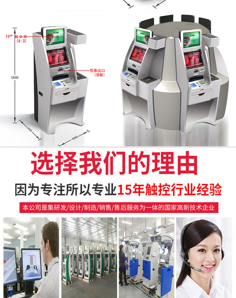 專業(yè)提供電腦觸控產(chǎn)品、自助服務(wù)終端的設(shè)計(jì)及生產(chǎn)服務(wù),主要產(chǎn)品自助終端機(jī)、自助打印機(jī)、自助取票機(jī)、自助查詢機(jī)、自助繳費(fèi)機(jī)、自助發(fā)卡機(jī)、自助政務(wù)一體機(jī),產(chǎn)品使用于各個行業(yè);醫(yī)院、學(xué)校、銀行、酒店、景區(qū)等。。。。。公司擁有專業(yè)的生產(chǎn)線,嚴(yán)格的質(zhì)量把控。耐心的咨詢服務(wù)團(tuán)隊(duì)及專業(yè)的技術(shù)負(fù)責(zé)團(tuán)體。