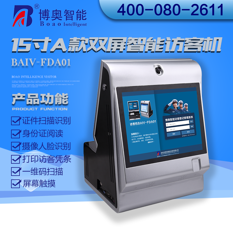 ? ? ? ?15寸A款雙屏智能訪客機(jī)主要用在政府機(jī)關(guān)、關(guān)口、機(jī)場(chǎng)、軍隊(duì)、公安、法院、學(xué)校、事業(yè)單位、花園小區(qū)、高檔寫字樓、工廠等門衛(wèi)傳達(dá)室用來(lái)訪客登記管理。