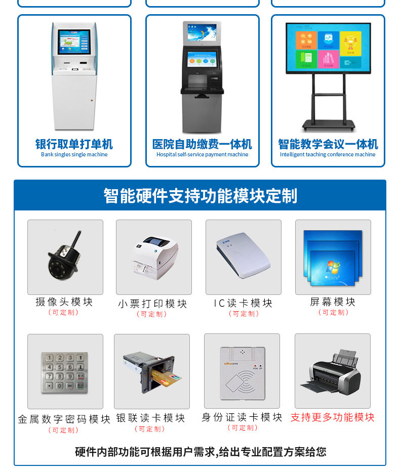 專業(yè)提供電腦觸控產(chǎn)品、自助服務(wù)終端的設(shè)計及生產(chǎn)服務(wù),主要產(chǎn)品自助終端機、自助打印機、自助取票機、自助查詢機、自助繳費機、自助發(fā)卡機、自助政務(wù)一體機,產(chǎn)品使用于各個行業(yè);醫(yī)院、學(xué)校、銀行、酒店、景區(qū)等。。。。。公司擁有專業(yè)的生產(chǎn)線,嚴格的質(zhì)量把控。耐心的咨詢服務(wù)團隊及專業(yè)的技術(shù)負責團體。