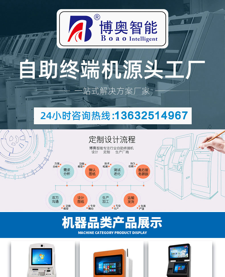 專業(yè)提供電腦觸控產(chǎn)品、自助服務(wù)終端的設(shè)計(jì)及生產(chǎn)服務(wù),主要產(chǎn)品自助終端機(jī)、自助打印機(jī)、自助取票機(jī)、自助查詢機(jī)、自助繳費(fèi)機(jī)、自助發(fā)卡機(jī)、自助政務(wù)一體機(jī),產(chǎn)品使用于各個行業(yè);醫(yī)院、學(xué)校、銀行、酒店、景區(qū)等。。。。。公司擁有專業(yè)的生產(chǎn)線,嚴(yán)格的質(zhì)量把控。耐心的咨詢服務(wù)團(tuán)隊(duì)及專業(yè)的技術(shù)負(fù)責(zé)團(tuán)體。