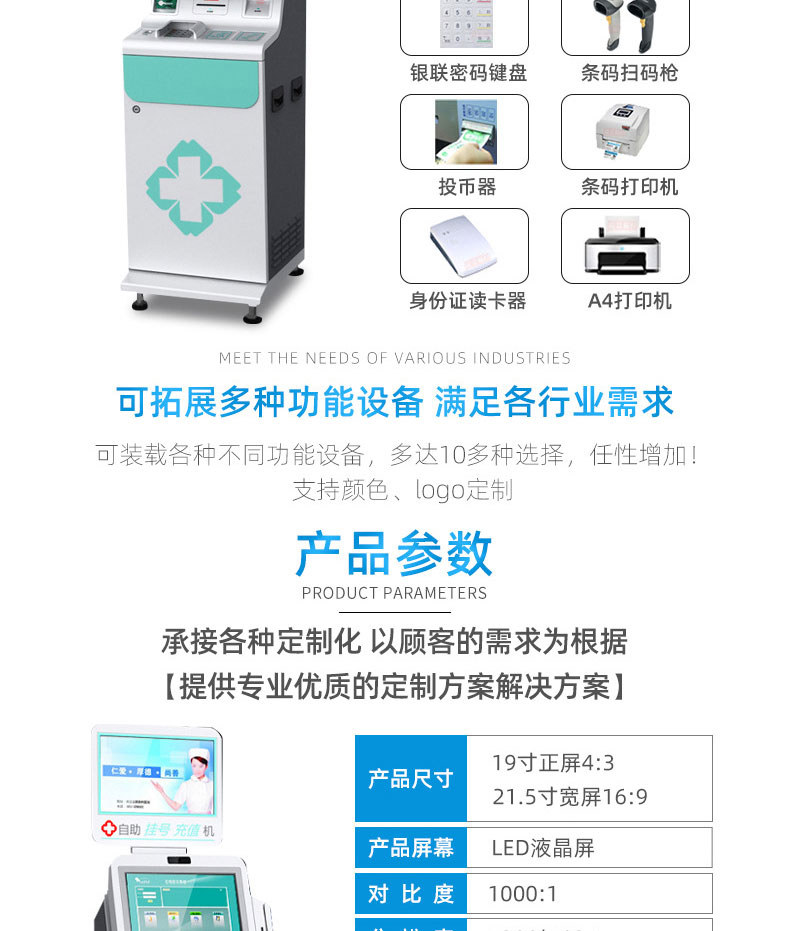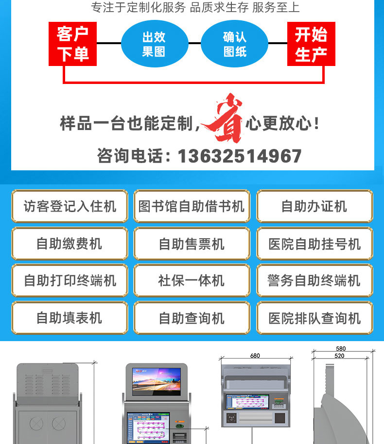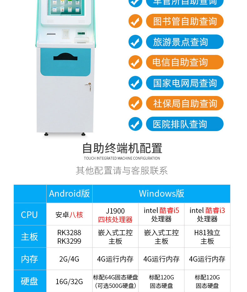 自助終端機(jī)定制:定制各種場(chǎng)景各種款式非標(biāo)終端機(jī);例如訪客機(jī)、景區(qū)自助取票機(jī)、醫(yī)院繳費(fèi)查詢機(jī)、醫(yī)院自助取單機(jī)、社保查詢機(jī)、室內(nèi)外廣告機(jī)、排隊(duì)叫號(hào)機(jī)、工控一體機(jī)、電力繳費(fèi)查詢機(jī)、圖書自助銷售機(jī)、便攜式計(jì)算機(jī)、酒店自助入住機(jī)、自助收銀機(jī)等終端。
