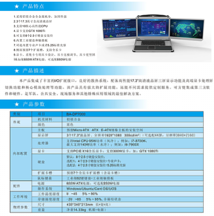 便攜式三屏計(jì)算機(jī)采用鋁鎂合金全金屬機(jī)身,加固性強(qiáng),外觀精美,體積輕巧,方便攜帶,達(dá)到工業(yè)級性能;本產(chǎn)品集成了豐富的I/O擴(kuò)展接口, 良好的散熱系統(tǒng), 配備高性能17.3"高清液晶屏,三屏顯示功能及高端顯卡處屏切換功能和核心模塊處理等功能, 該產(chǎn)品具有強(qiáng)大的擴(kuò)展功能, 還能不同需求提供定制服務(wù)??煞奖慵傻谌浖陀布?。是軍隊(duì)、公共安全、現(xiàn)場服務(wù)和其他特殊應(yīng)用領(lǐng)域的最佳解決方案!