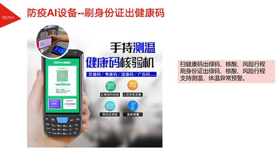 為加速各地落實(shí)健康碼助力疫情防控、一碼通行、科學(xué)防疫,健康碼測溫人臉識別一體機(jī),基于人臉識別算法和紅外熱成像測溫算法,可與國康碼、及各地健康碼平臺相對接,實(shí)現(xiàn)證、碼、臉 三合一,保證人臉精準(zhǔn)測溫,實(shí)時篩查通行人員健康情況,讓公共安全疫情防控更到位。該產(chǎn)品廣泛適用于辦 公、酒店、寫字樓、校園、商場、社區(qū)等公共服務(wù)場所,助力疫情防控,實(shí)現(xiàn)科技防疫。