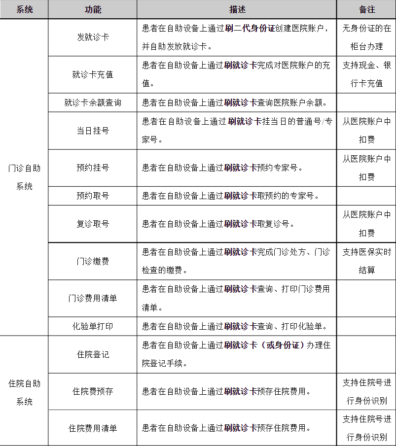 住院自助系統(tǒng)?新增住院自助系統(tǒng),通過投放自助服務(wù)終端(含機(jī)上軟件),實(shí)現(xiàn):?住院登記(通過二代身份證、就診卡)、住院費(fèi)預(yù)存、住院費(fèi)用清單查詢、打印等功能。