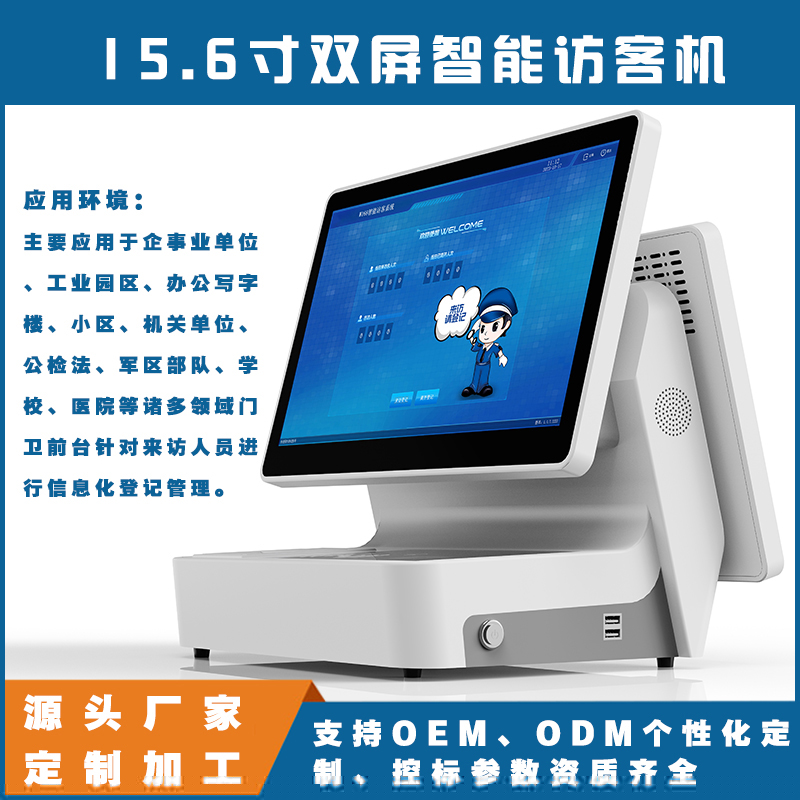 15.6寸雙屏智能訪(fǎng)客機(jī)是一種具有兩個(gè)15.6英寸屏幕的訪(fǎng)客管理設(shè)備,它主要用于企事業(yè)單位、政府機(jī)關(guān)、金融機(jī)構(gòu)等場(chǎng)所的訪(fǎng)客登記和管理。這種設(shè)備的設(shè)計(jì)旨在提供一種高效、安全且用戶(hù)友好的訪(fǎng)客體驗(yàn)。以下是15.6雙屏智能訪(fǎng)客機(jī)的一些主要特點(diǎn)和功能: