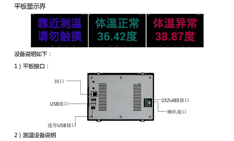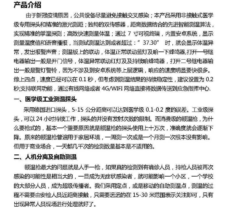 由于新冠疫情原因,公共設(shè)備盡量避免接觸交叉感染;本產(chǎn)品采用非接觸式醫(yī)學(xué)級專用探頭和精準(zhǔn)的激光測距;獨特的雙傳感器,距離數(shù)據(jù)結(jié)合的先進(jìn)智能測溫算法,實現(xiàn)精準(zhǔn)的掌溫探測;高效快速測量體溫;通過7寸可視終端,內(nèi)置安卓系統(tǒng),顯示測量溫度值和語音播報,當(dāng)測試測溫達(dá)到或者超過:”37.30”