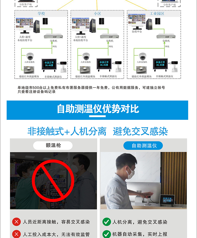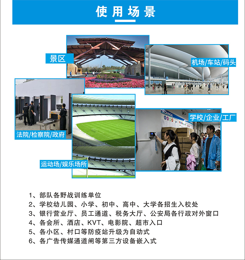 本產(chǎn)品安裝簡單、方便,可移動工作,可做自助測溫點等場景獨立使用;使用于學(xué)校、店鋪、政府企業(yè)等單位;