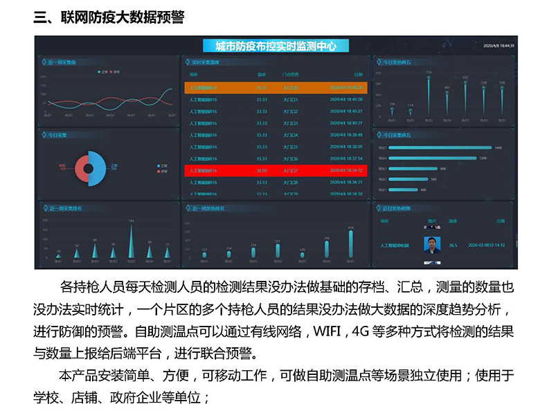 各持槍人員每天檢測人員的檢測結(jié)果沒辦法做基礎(chǔ)的存檔、匯總,測量的數(shù)量也沒辦法實時統(tǒng)計,一個片區(qū)的多個持槍人員的結(jié)果沒辦法做大數(shù)據(jù)的深度趨勢分析,進(jìn)行防御的預(yù)警。自助測溫點可以通過有線網(wǎng)絡(luò),WIFI,4G等多種方式將檢測的結(jié)果與數(shù)量上報給后端平臺,進(jìn)行聯(lián)合預(yù)警。