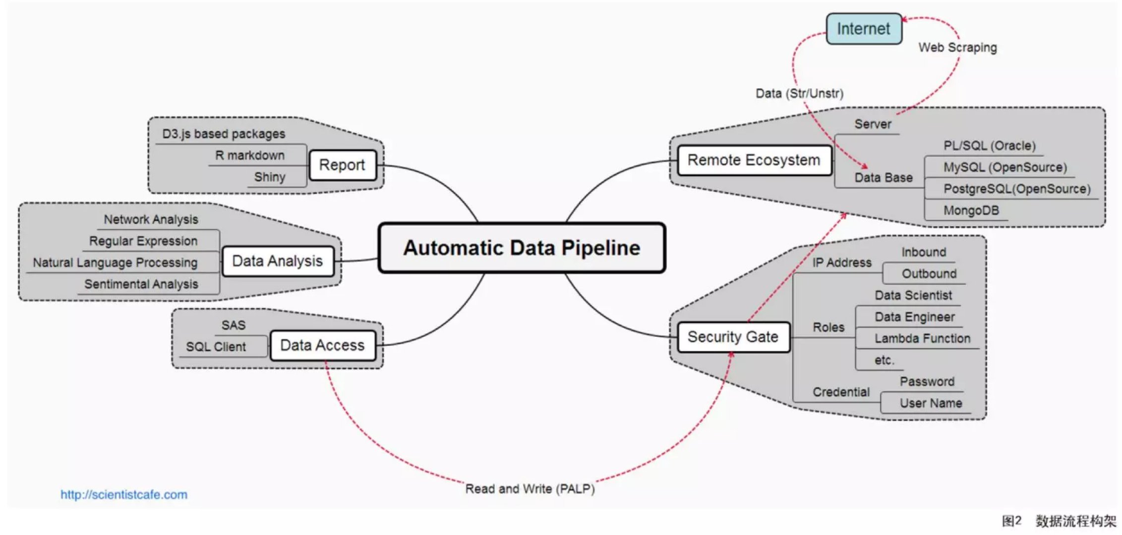 ? ? ? 數(shù)據(jù)科學家需要另外掌握的一個重要的技能是分析建模。圖2 是數(shù)據(jù)流程構(gòu)架圖,這個模塊可以進一步細分成下面幾個:?