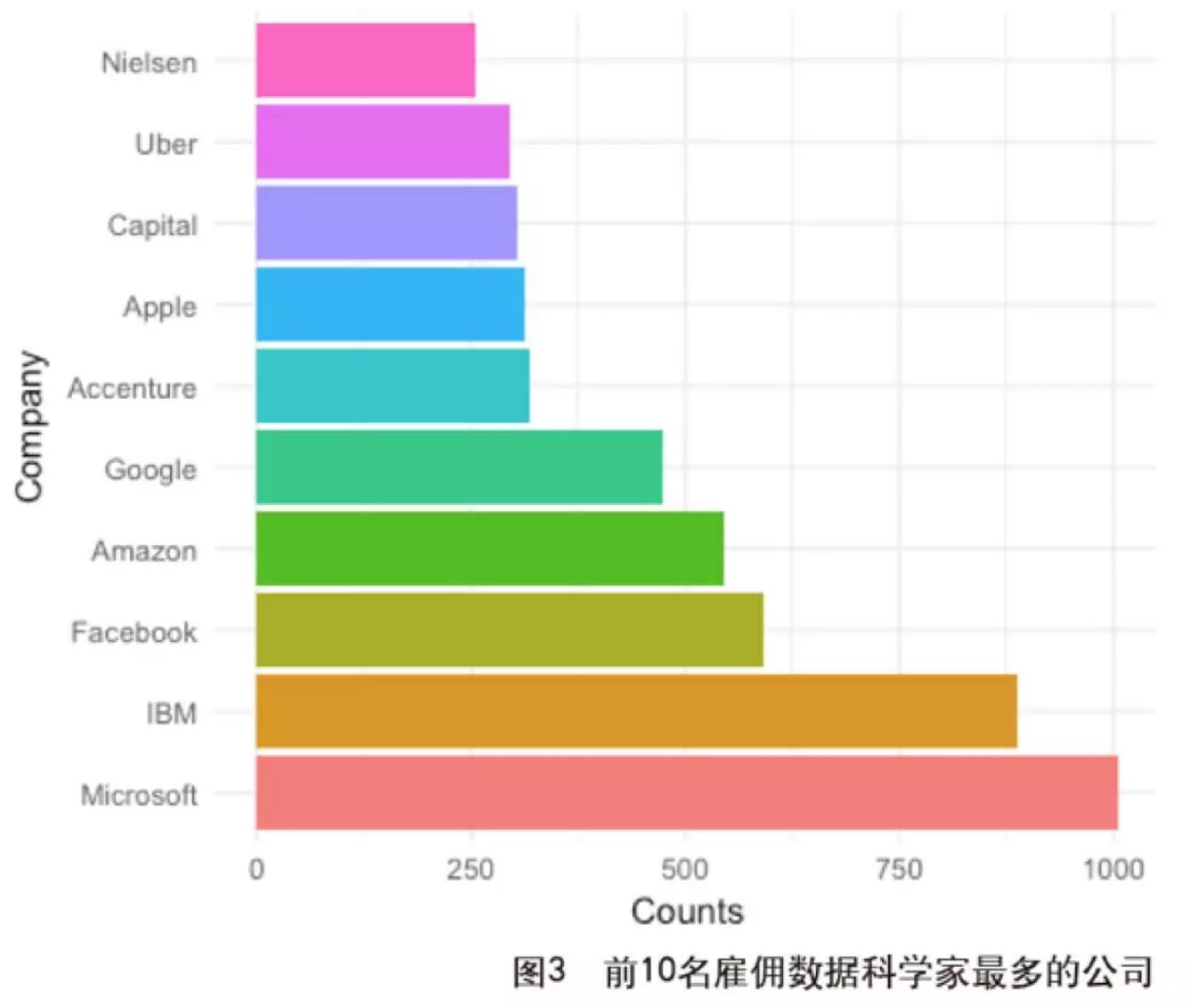 我們從數(shù)據(jù)上看看數(shù)據(jù)科學的現(xiàn)狀吧。從最大的職業(yè)社交網(wǎng)站領(lǐng)英( LinkedIn )的數(shù)據(jù)看來,數(shù)據(jù)科學家職位的年薪在7.5萬~17萬美元之間,中位數(shù)是11.3萬美元。其中雇傭數(shù)據(jù)科學家的公司主要集中在微軟、IBM、Fackbook、亞馬遜、Google這些計算機互聯(lián)網(wǎng)公司,圖3 為前10名雇傭數(shù)據(jù)科學家最多的公司。