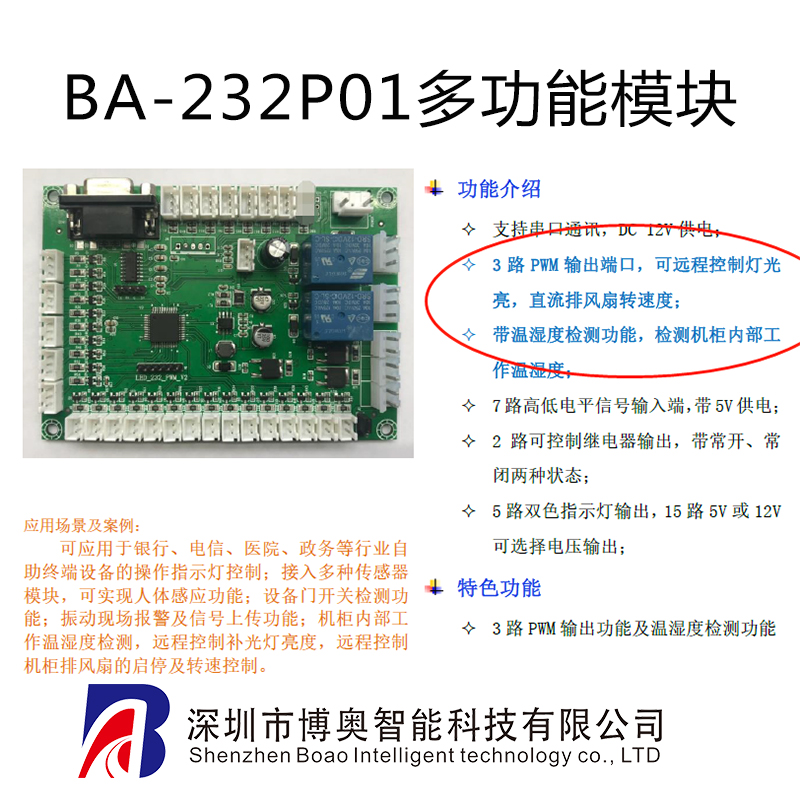 該產(chǎn)品是專為自助終端設(shè)備配套開發(fā)的一款多功能控制模塊,可應(yīng)用此模塊實(shí)現(xiàn)各模塊操作指示燈的提示控制、接收開關(guān)量的輸入上傳、繼電器常開、常閉輸出、PWM輸出功能以及溫濕度檢測功能;