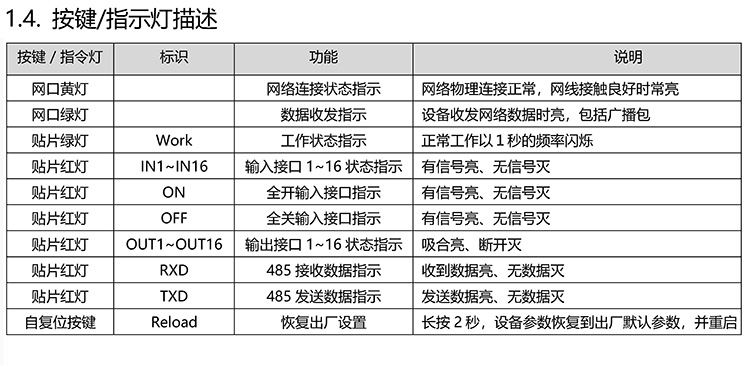 ??? 設(shè)備采用工業(yè)級設(shè)計方案,搭載32 ARM 處理器和10/100M 以太網(wǎng)網(wǎng)絡(luò)方案,具有速度快,運算能力強,穩(wěn)定性高,抗干擾能力強等特點,滿足工業(yè)環(huán)境使用要求。設(shè)備有16 路繼電器輸出、18 路開關(guān)量隔離輸入和1 RS485 接口,繼電器支持實時控制、延時控制、輸入輸出聯(lián)動控制、一鍵全開全關(guān)控制、日循環(huán)定時控制和自定義日期控制等多種控制方式,開關(guān)量輸入狀態(tài)支持被動上傳、定時上傳和觸發(fā)上傳,RS485 接口支持用于控制設(shè)備或傳輸數(shù)據(jù),以滿足更多不同的場合使用,滿足更多用戶的使用需求。