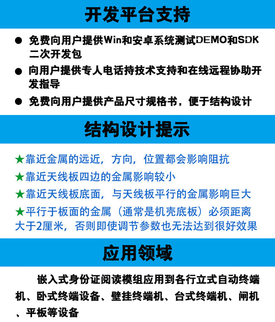 嵌入式多功能身份證閱讀器模組,包含身份證SAM核心模塊、主控板、天線板、數(shù)據(jù)通信線等配件,外觀體積小、結(jié)構(gòu)緊湊、安裝方便、性能可靠、接口豐富(UBS、RS232、TTL);便于結(jié)構(gòu)設(shè)計等特點(diǎn);可內(nèi)置于各行立式自動終端、柜式終端、臥式終端、壁掛終端、臺式終端、閘機(jī)、平板等設(shè)備中,廣泛應(yīng)用于政府、民政、金融、通信、教育、交通、企業(yè)、小區(qū)、酒店等各行業(yè)