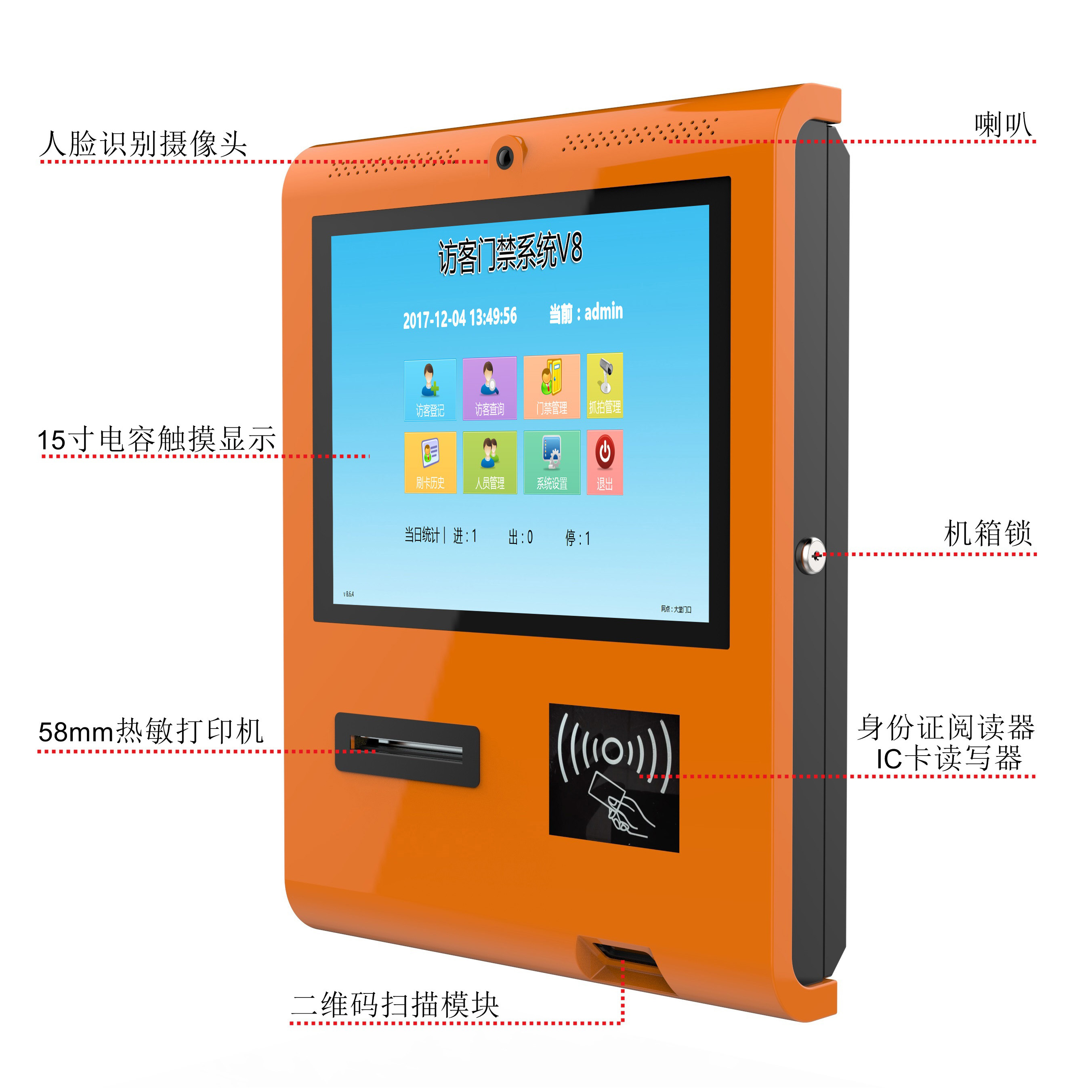 ?? ??15寸壁掛式訪客機(jī)是博奧智能針對(duì)政府機(jī)關(guān)、軍隊(duì)、公安、法院、學(xué)校、事業(yè)單位、花園小區(qū)、高檔寫字樓、工廠等門衛(wèi)傳達(dá)室設(shè)計(jì)加工的一款進(jìn)出人員信息化登記設(shè)備,從而代替了傳統(tǒng)的手工登記,有效的提高了門衛(wèi)管理工作效率及證件信息登記準(zhǔn)確性,為日后的信息查詢工作更方便量更快捷。整機(jī)采用流線性設(shè)計(jì),符合人體工程原理,結(jié)構(gòu)合理,外形美觀大方,操作簡(jiǎn)單,維護(hù)方便。