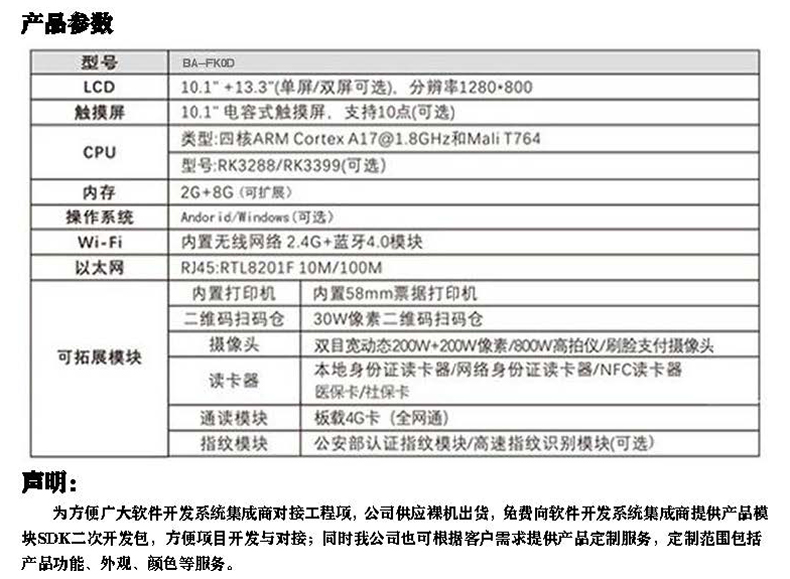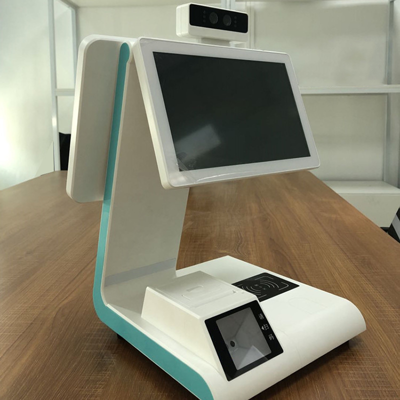 功能配置:主屏10.1寸 副屏13.3寸 身份證閱讀器 IC卡讀寫器 58mm熱敏打印機(jī) 條碼掃描儀 指紋(選配)