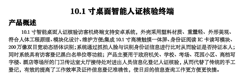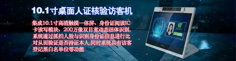 10.1寸智能桌面人證核驗(yàn)訪客機(jī)終端支持安卓系統(tǒng),外殼采用塑料材質(zhì)、重量輕、外形美觀、符合人體工程原理、模塊化設(shè)計(jì)、維護(hù)方便;集成10.1寸高清觸摸一體屏、身份證閱讀IC卡讀寫模塊、200萬像雙目寬動(dòng)態(tài)活體識(shí)別;系統(tǒng)通過抓拍人臉與識(shí)別身份證信息進(jìn)行比對(duì)從而驗(yàn)證是否持證本人;同時(shí)系統(tǒng)具有訪客登記黑白名單位等功能;產(chǎn)品主要用于政府機(jī)關(guān)、學(xué)校、考場、花園小區(qū)、高檔寫字樓、酒店等場所的門衛(wèi)傳達(dá)室大廳接待處對(duì)進(jìn)出人員信息化登記人證核驗(yàn),從而代替了傳統(tǒng)的手工登記,有效的提高了工作效率及證件信息登記準(zhǔn)確性,使日后的信息查詢工作更方便更快捷。