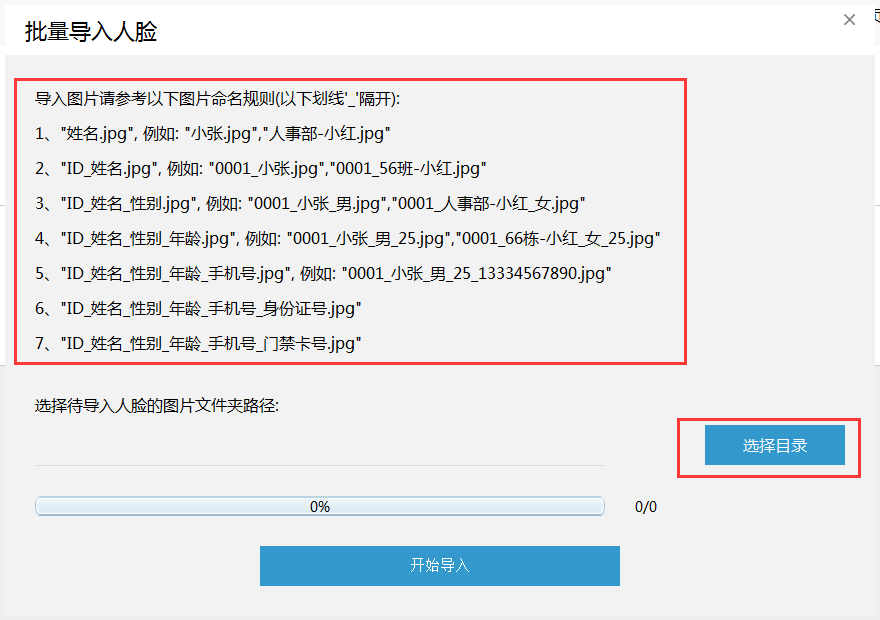 點擊【批量導(dǎo)入】,彈出界面è點擊【選擇目錄】,選擇人臉圖片文件夾è點擊【開始導(dǎo)入】,導(dǎo)入進度條完成即完成批量導(dǎo)入人臉操作。